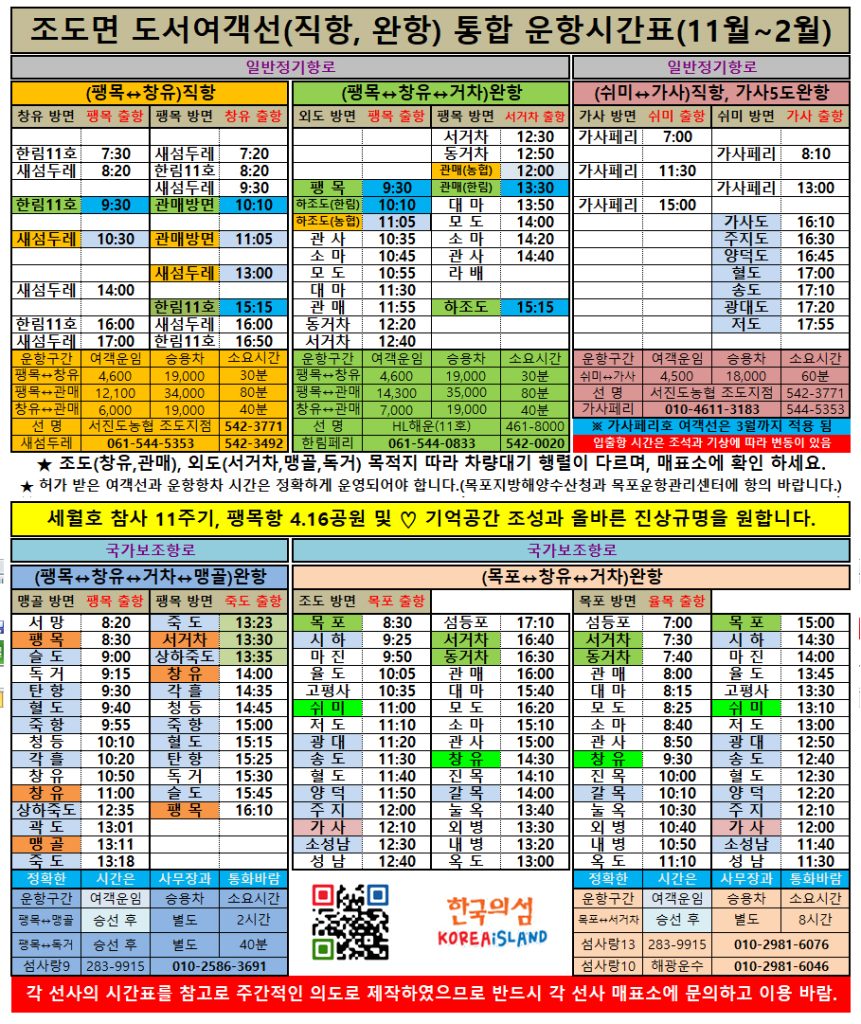 차량승선 대기행렬은 터미널 옆 대기차선 순번대로 여객선 승선표를 발급 받으실 수 있도록 대기차로를 지켜주세요. 또한, 11월1일부터 조도면 도서여객선 시간표(2025년11월1일부터 2026년2월28일까지)로 변경되어 운항 합니다.