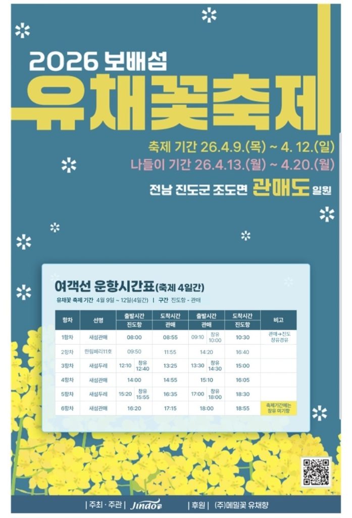 올해는 관매도 8만평의 유채 단지에서 ‘2026 보배섬 유채꽃축제(4월9일~12일, 13일~20일)’가 진행될 예정으로, 오는 4월1일부터 새섬관매호가 취항하게 되어 조도면 여객선이 증편되는 반가운 소식이 있었다.