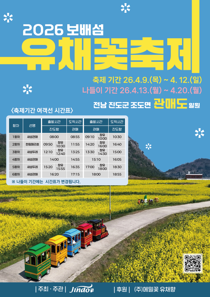 ※ 오는 4월1일 “새섬관매호”가 취항함에 따라서 조도면 도서여객선 시간표(2026년4월1일부터 2026년10월28일까지)로 변경되어 운항하며, 관매도에서 4월9일부터 4월12일 2026 보배섬 유채꽃축제 기간 여객선 운항시간이 변경되므로 <축제기간 여객선 시간표> 내용을 참고하시기 바랍니다.